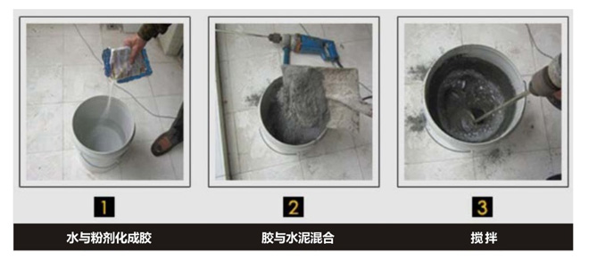 倒入冷水50公斤左右的桶內(nèi)開動攪拌器,邊攪拌邊慢慢倒入粉劑一包(500克)攪拌3-5分鐘后即可溶解成膠狀,濃度可自行需調(diào)整。溶解成膠狀可配制4-5包水泥,能和水泥迅速產(chǎn)生反應,提高粘結度和牢固度,用時再攪拌一次(避免沉淀),效果更佳。