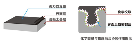 施工時,一方面卷材反應(yīng)膠粘料與水泥漿(或現(xiàn)澆混凝土)接觸后發(fā)生水解反應(yīng),生成醚鍵,使水化硅酸鈣漿與卷材膠料層形成化學(xué)交聯(lián)結(jié)構(gòu)產(chǎn)生粘結(jié);另一方面,膠層和水泥漿充分濕潤后,雙方表面張力接近,使二者緊密結(jié)合,產(chǎn)生物理吸附作用。故而使卷材與水泥漿(或現(xiàn)澆混凝土)起到“化學(xué)交聯(lián)-物理榫卯”的協(xié)調(diào)反應(yīng)粘結(jié),達(dá)到牢固的"肌膚式"防水效果。