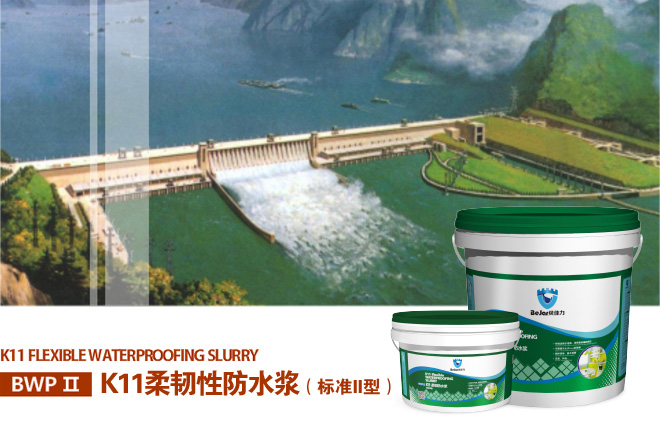 K11柔韌性防水漿是由丙烯酸乳液及精選助劑(液料)和優(yōu)質(zhì)水泥、級(jí)配砂及膠粉(粉料)按比例組成的雙組份、強(qiáng)韌塑膠改性聚合物水泥基防水漿料。將粉料和液料混合后涂刷,形成一層堅(jiān)韌的高彈性防水膜,該膜對(duì)混凝土和水泥砂漿有良好的粘附性,與基面結(jié)合牢固,從而達(dá)到長(zhǎng)久的防水效果。